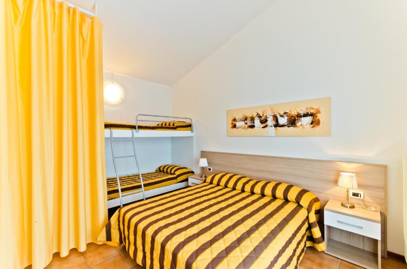 One-Bedroom Apartment (5 Adults). The apartments arein rows, each on 2 floors with 1 bedroom and a separate living room with kitchenette. There is a sofa bed in the living room and either 1 double and 1 single bed or 1 double and 1 bunk bed. The beds are assigned subject to availability and cannot be chosen by guests. ;