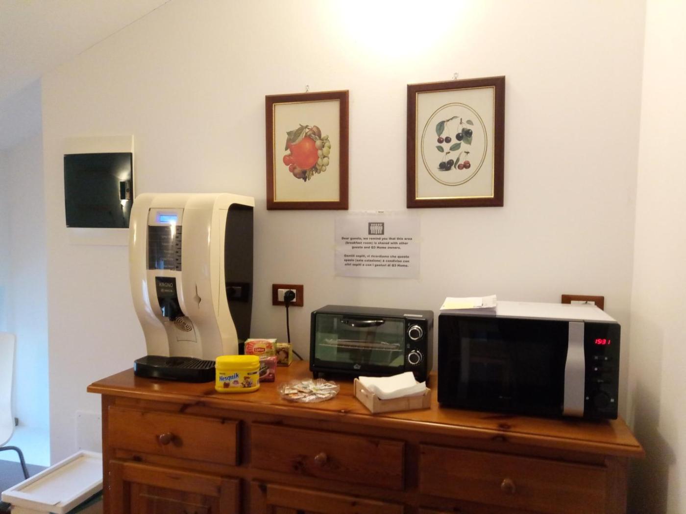 An Italian breakfast, including coffee, milk, yoghurt, jams, cookies and bread, is served daily.