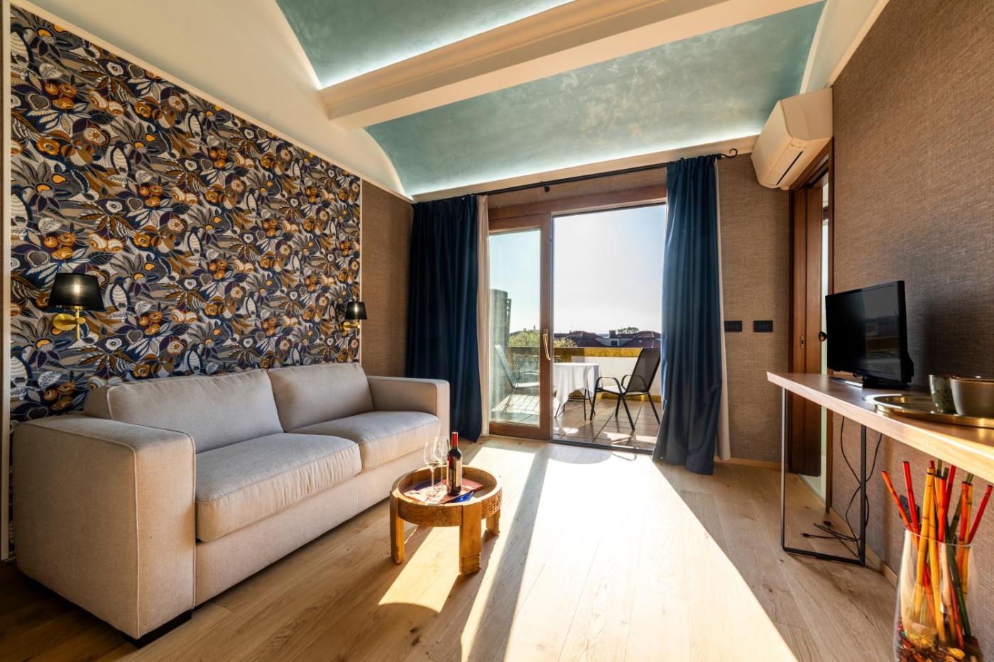 Suite with Terrace. Set in the attic, this air-conditioned suite has 1 bedroom, 1 living room, 2 bathrooms and a private terrace overlooking the Venice Lagoon. Pets are not allowed in the Suite with terrace.
